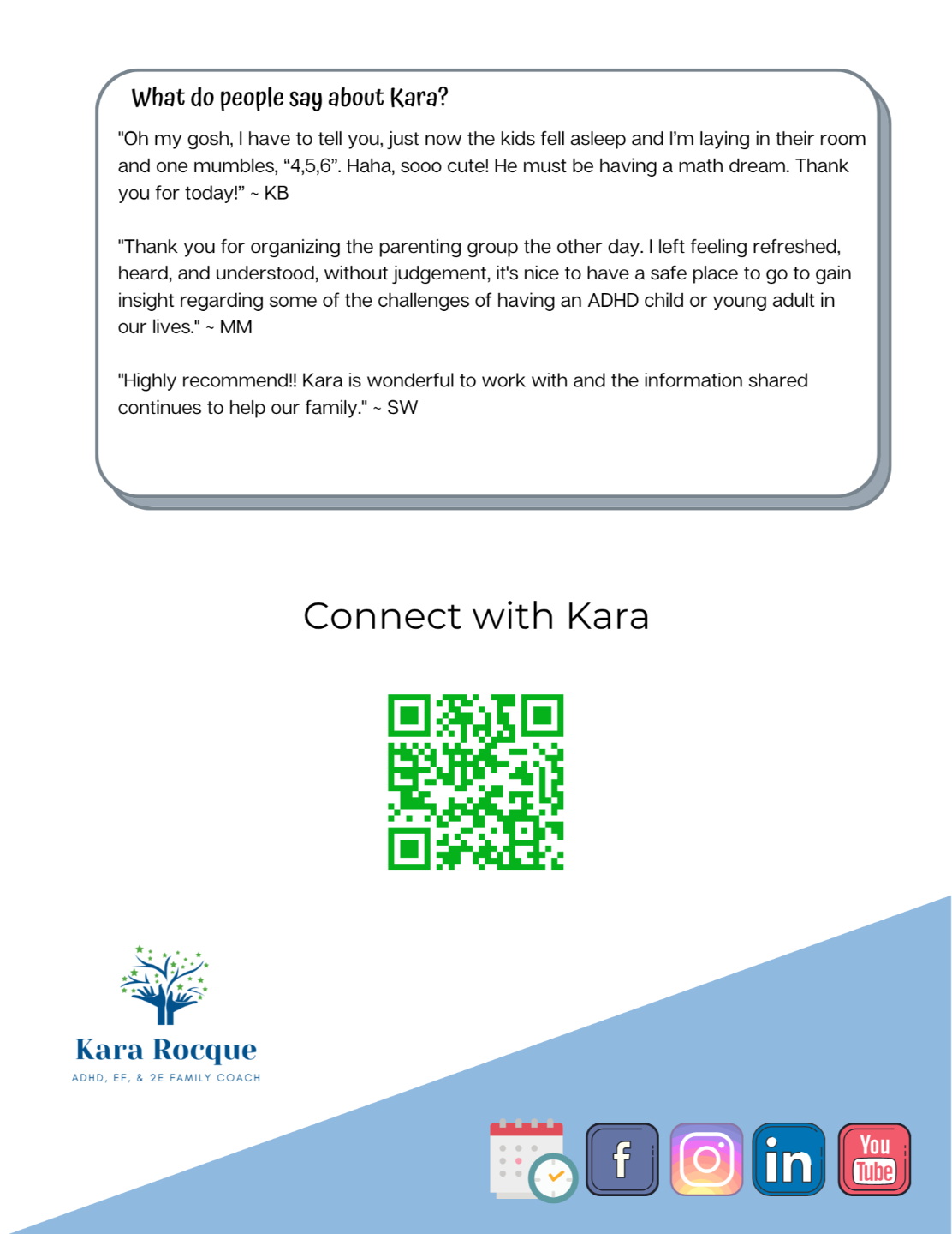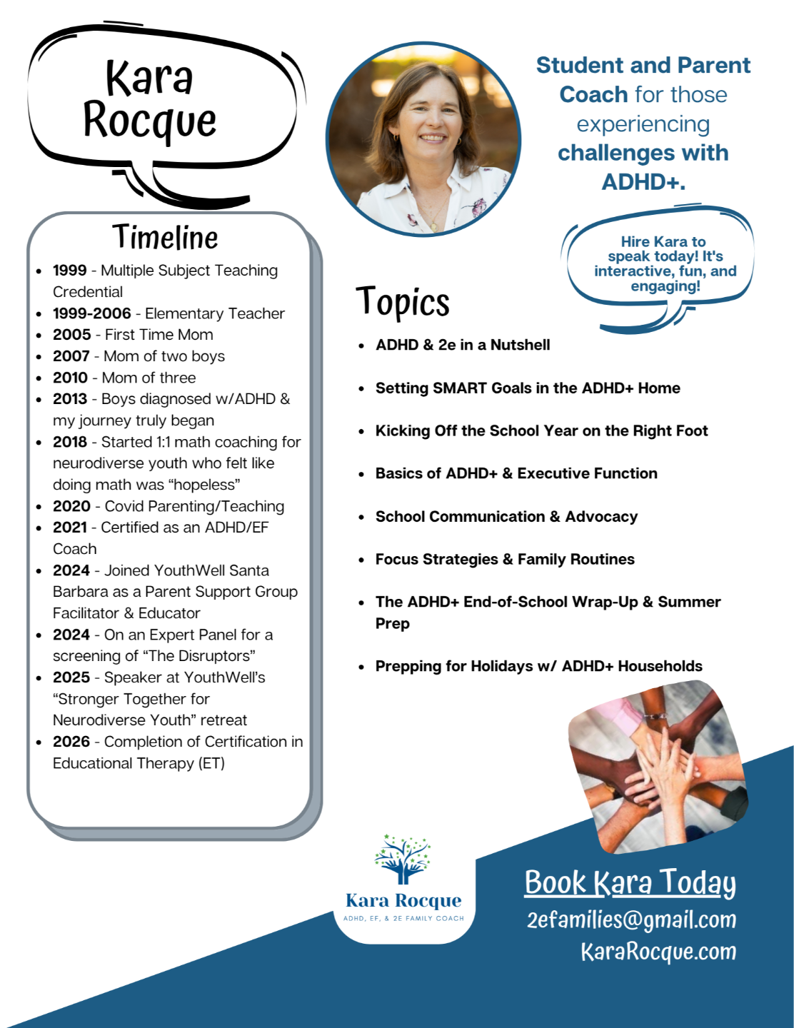 I offer personalized 1-1 coaching for parents and/or students in the areas of ADHD, Executive Functions, 2e, and K-8th Math support.